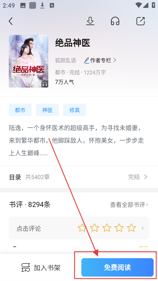1、在小说详情页,点击【免费阅读】按钮,进入小说阅读页面啦。