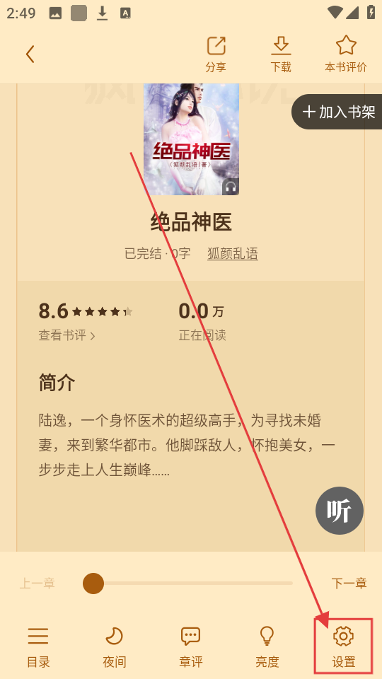 2、在阅读页面,点击右下角【设置】按钮,进入阅读设置页面哦。