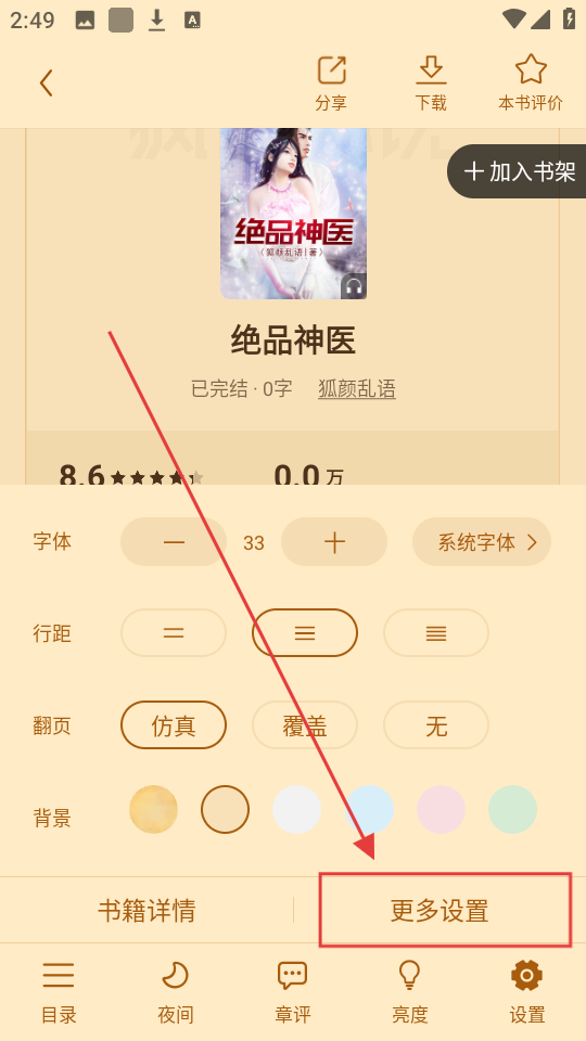 3、在阅读设置页面,点击【更多设置】选项,进入更多设置页面呢。