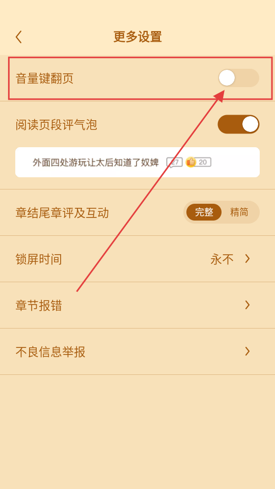 4、在更多设置页面,找到【音量键翻页】选项,开启后即可通过音量键翻页,优化阅读体验啦。