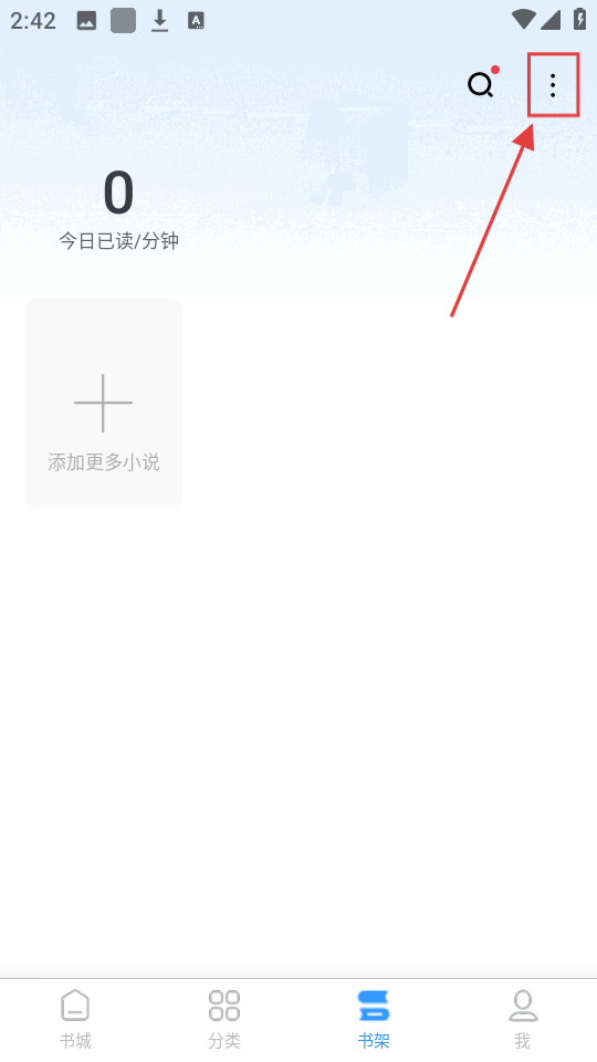 1、在书架页面,点击右上角的三点图标,展开功能菜单,开启本地导入小说的操作吧。