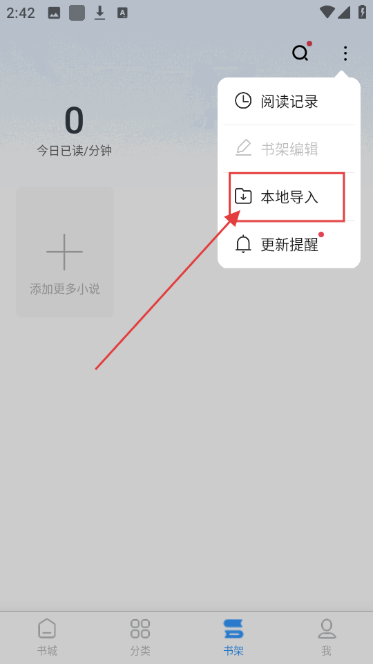 2、展开菜单后,选择【本地导入】,就能进入导入本地书的页面,开始导入小说啦。