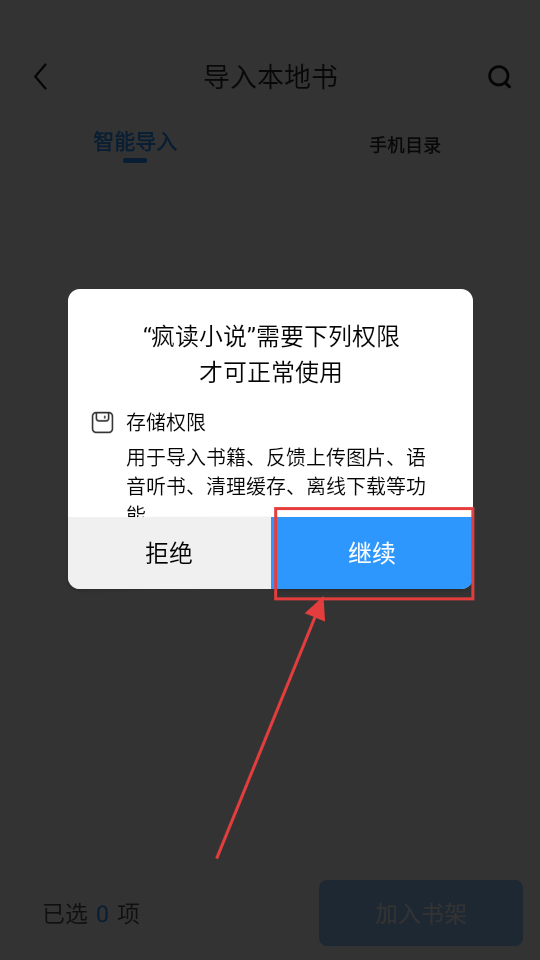 3、进入导入页面后,会弹出权限请求,点击【继续】,授予存储权限,才能正常导入哦。