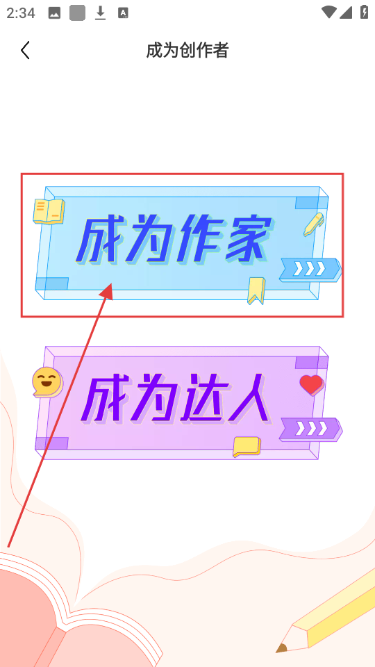 2、进入创作者选择页面后,点击【成为作家】选项,可进入成为作家的详情页面啦。
