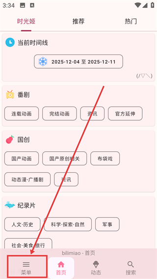 1、在【时光姬】首页点击底部的【菜单】按钮,就能展开个人功能面板,找到设置相关的操作入口啦。