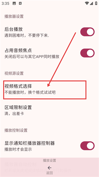4、在播放设置页找到【视频格式选择】选项,点击它就能切换视频格式,解决播放异常的问题哦。