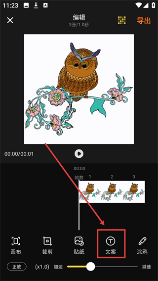 2、进入编辑页后,点底部的【文案】按钮,能给GIF添加文字内容,丰富作品表现啦。