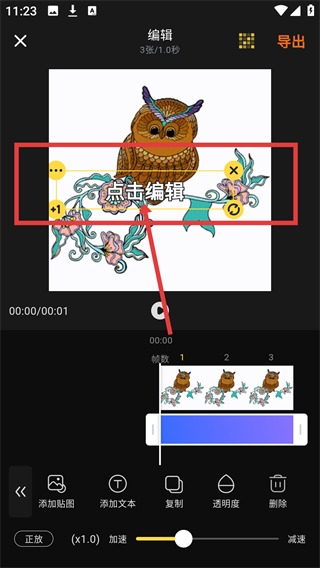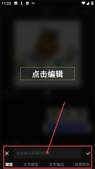3、添加文案后,点【点击编辑】区域,可唤出文案编辑菜单,调整文字的相关属性呢。