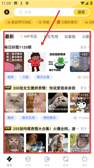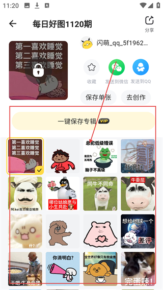 1、在首页浏览各类表情专辑,比如【每日好图1120期】,点击专辑区域就能进入详情页查看更多表情啦。