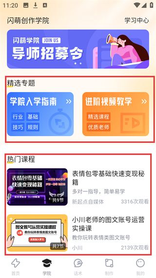 3、在学院页面查看【精选专题】和【热门课程】,选择合适的课程就能学习表情创作技巧啦。