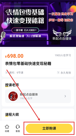 4、在课程详情页确认信息后,点击【立即购课】按钮,就能购买课程开始学习表情变现技能哦。