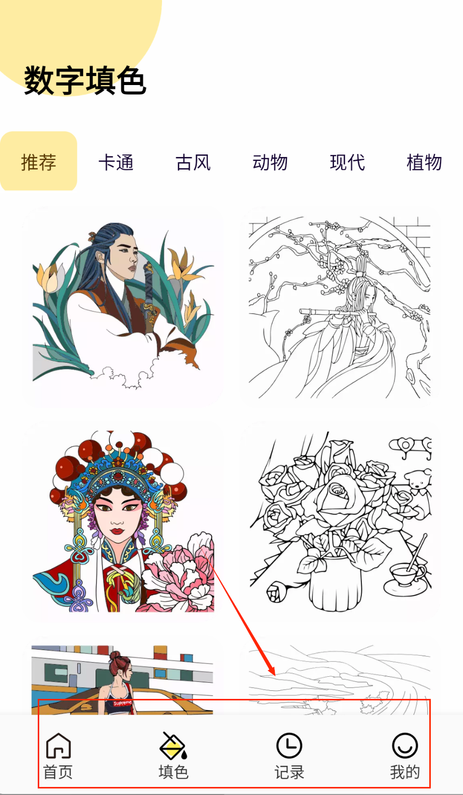 2、首页板块会推送热门填色图案和教程,新手可以多浏览获取灵感,还有不同分类如动物现代植物等,满足多样化填色需求。