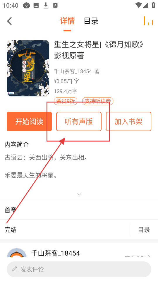 1、在小说详情页,咱们能看到【听有声版】按钮,点击它就能进入有声书选择页面,开启听书模式啦。