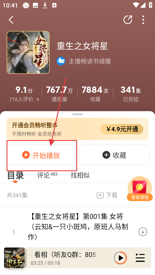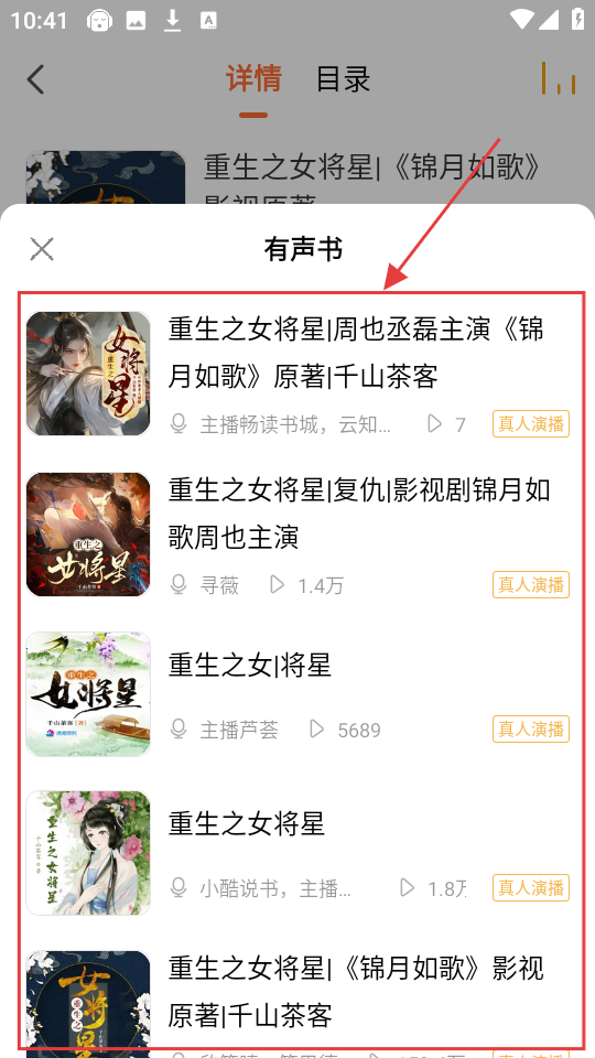 2、进入有声书页面后,这里有不少《重生之女将星》的有声版本,挑选一个喜欢的,点击就能进入有声书播放页面咯。