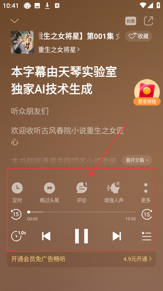 4、开始播放后,页面下方有定时、评论等功能按钮,大家可根据自身需求,去使用这些实用的功能呢。