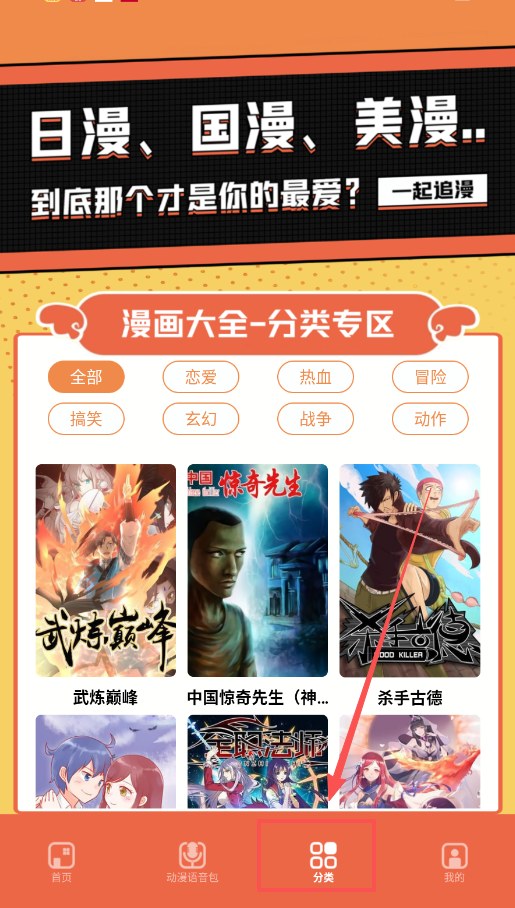 2、点击底部“分类”按钮,选择热血、搞笑等标签筛选喜欢的漫画类型。