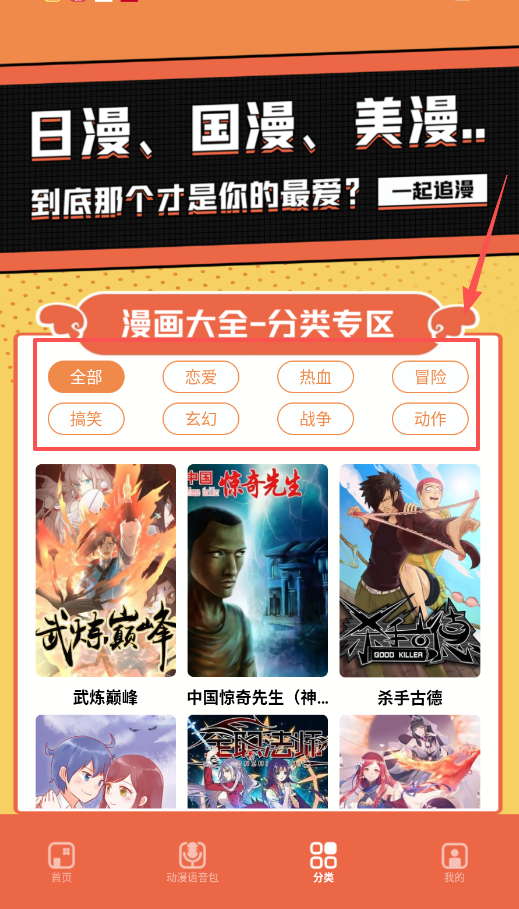 2、要是你有明确的漫画类型偏好,那就去“分类”页面看看,全部、冒险、搞笑等分类让你找漫画更省时间。