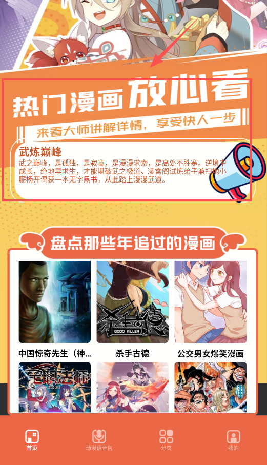 1、启动应用后,首页会展示武炼巅峰等热门漫画,直接点击就能阅读,往下滑动还能看到更多精选推荐内容。