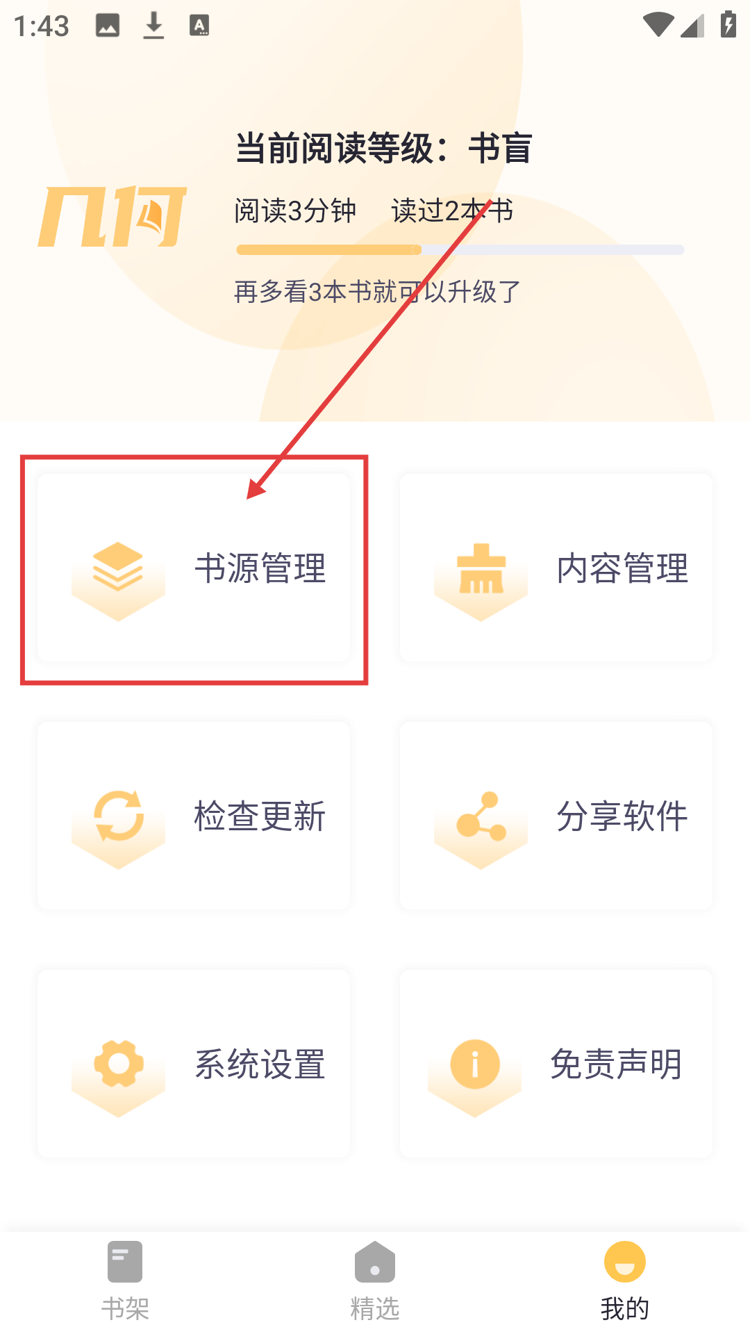 1、在“我的”页面,点【书源管理】,可进入书源管理页面哦。