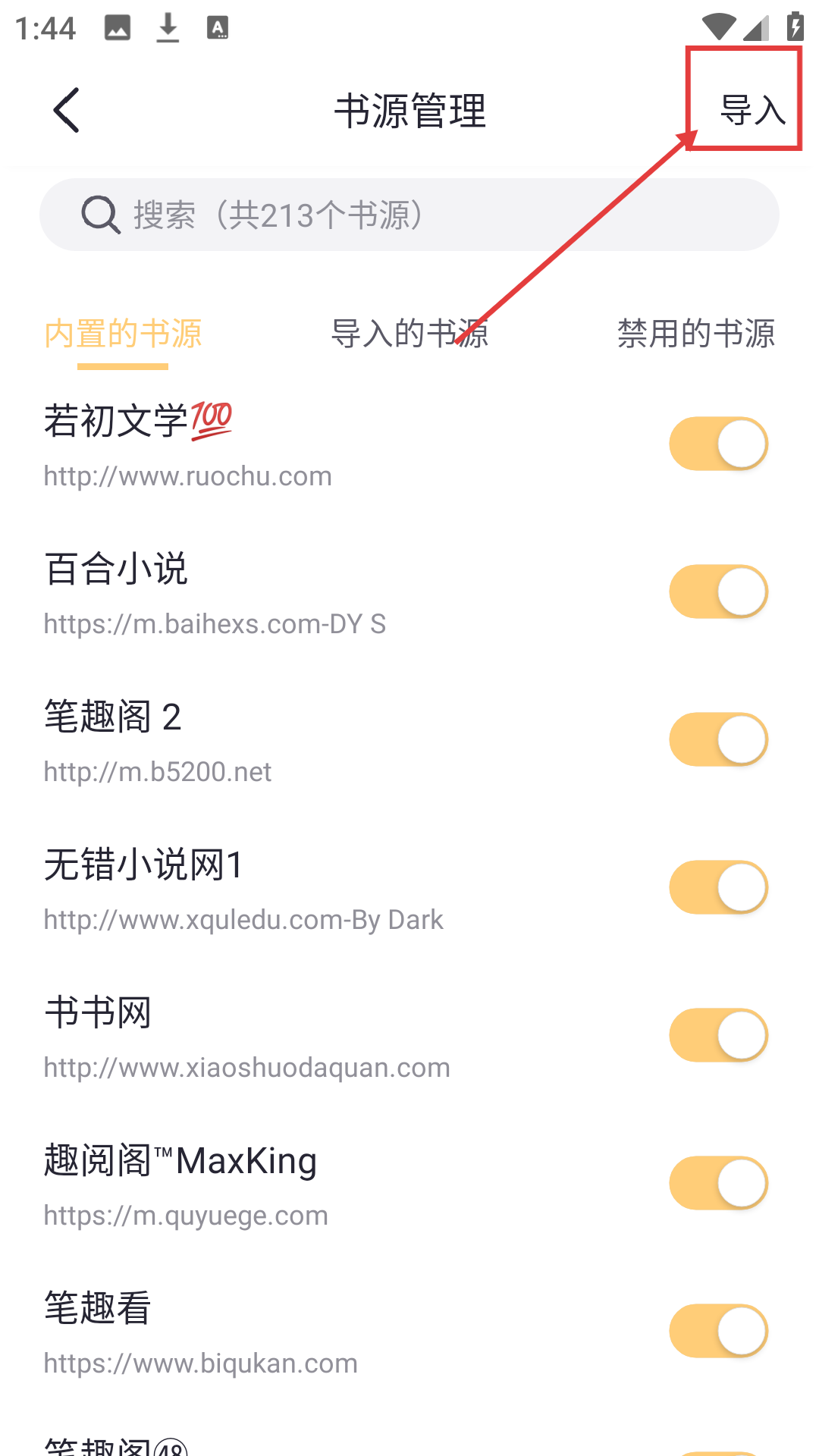 2、在书源管理页面,点右上角【导入】,可打开导入选项啦。