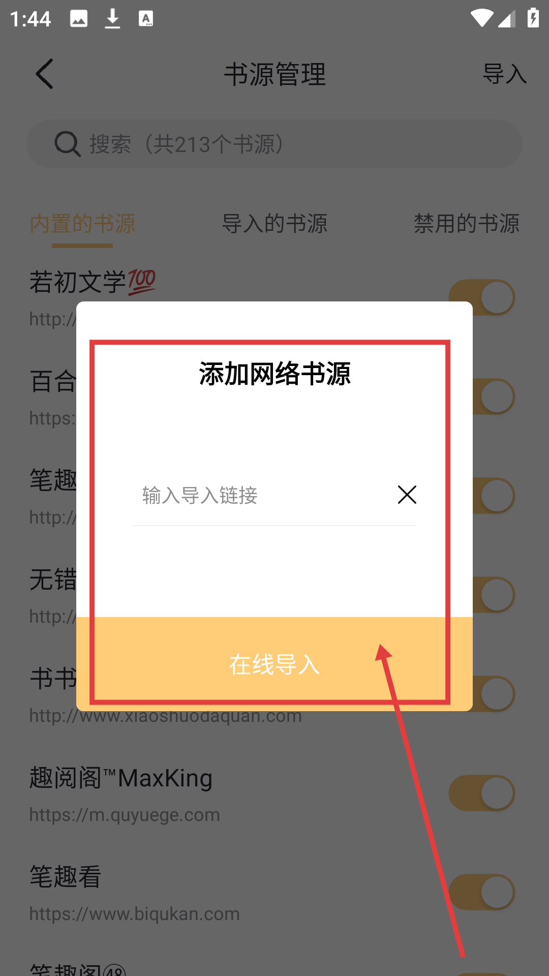 4、在添加网络书源框中,输入导入链接后点【在线导入】,即可完成网络书源添加哦。