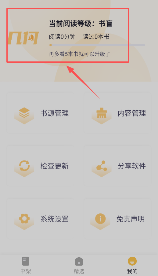 1、先点开底部我的页,看看当前阅读等级和进度,比如你是书盲级别,这里还能管理书源和系统设置哦。