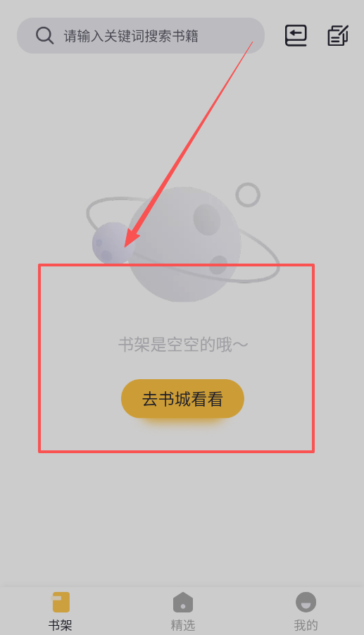 2、再到书架页瞧瞧,如果空空如也,别急,直接点击去书城看看,就能跳转到精选或搜索页找书啦,很方便呢。