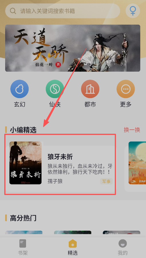 3、在精选页能看到小编推荐和高分热门作品,像狼牙未折这种,点开就能阅读,或者按玄幻仙侠等分类筛选,总能找到喜欢的。