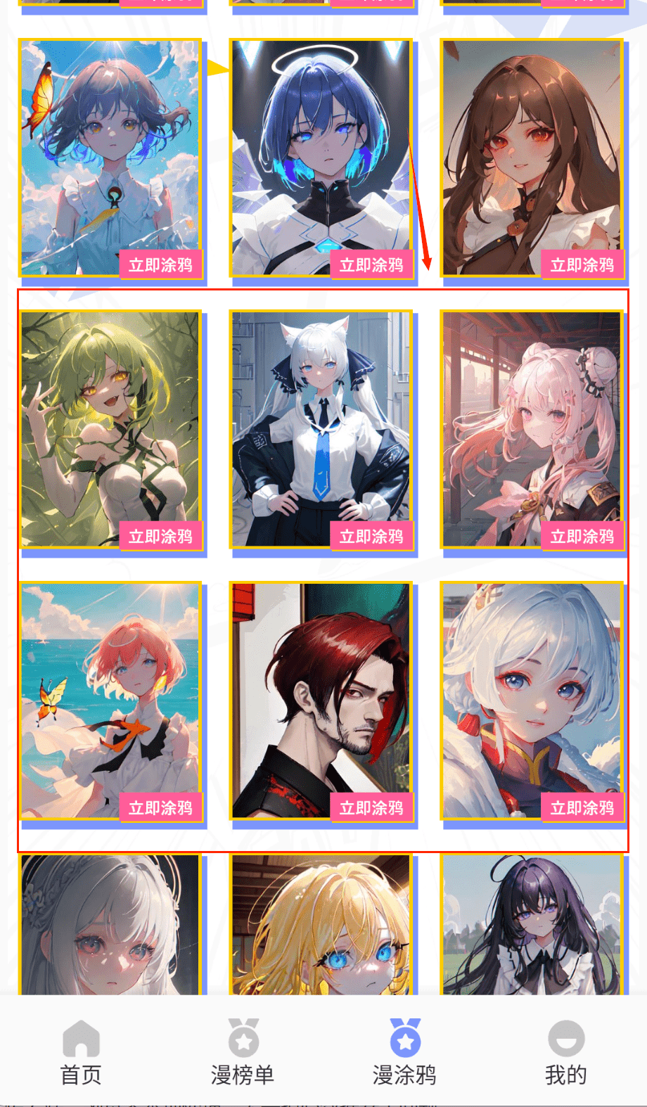 1、点击底部导航栏的"漫涂鸦"进入创意功能区,这里会展示多种风格的漫画线稿和模板,包括人物、场景等不同主题的创作素材。