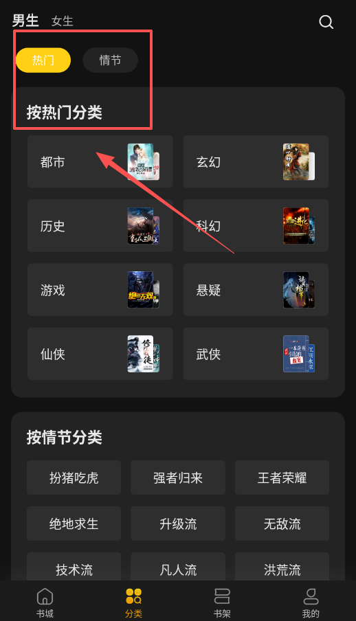 2、你可以去“分类”页面进行深度探索,软件提供了从性别、大类别到具体故事流派的层层筛选。