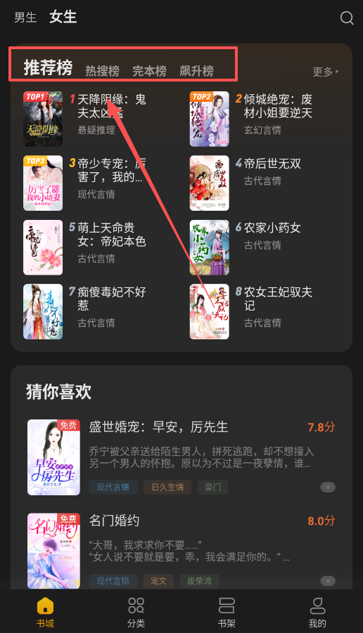 3、“书城”的多个榜单(如飙升榜、完本榜)是追踪热门趋势的窗口,而“猜你喜欢”的智能推荐。
