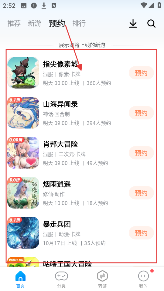 1、打开APP,在首页点击【预约】标签,进入预约页面,能看到即将上线的新游列表啦。