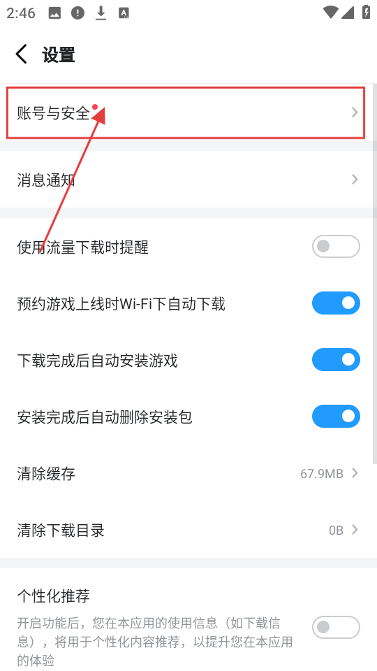 2、到设置页面,若想管理账号相关,就点击【账号与安全】选项,进入账号与安全页面。