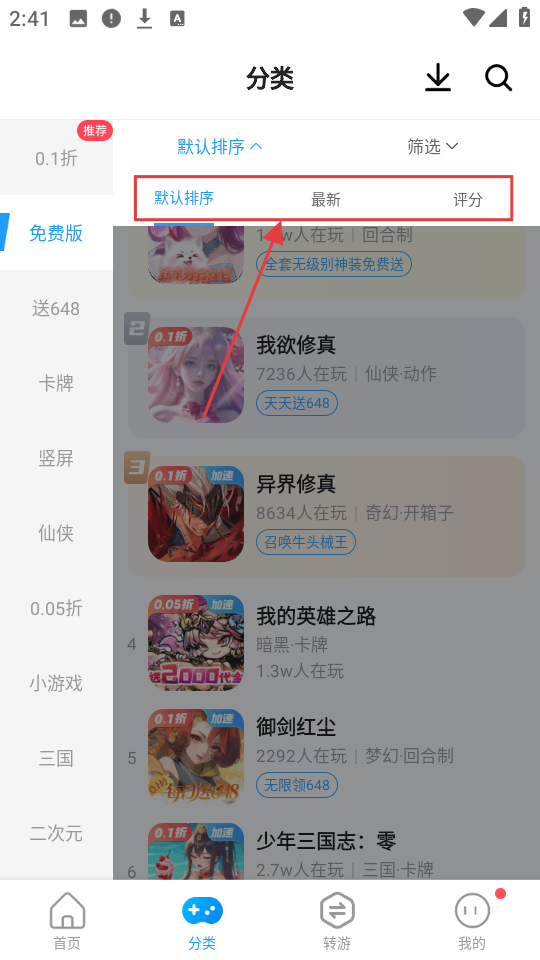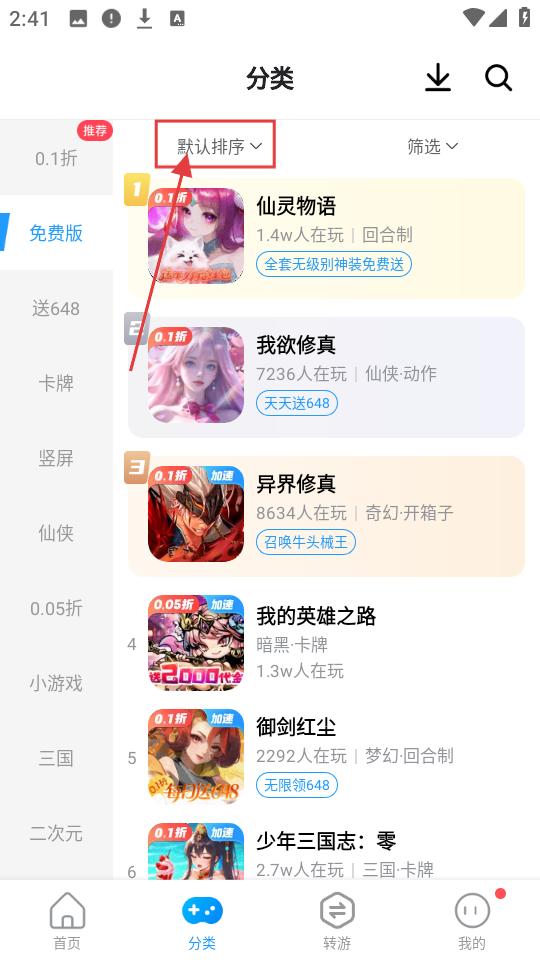2、在分类页面,若想调整游戏排序,点击【默认排序】,就能展开排序选项哦。