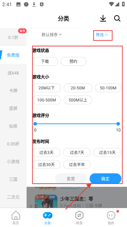 4、若想进一步筛选游戏,点击【筛选】,设置游戏状态、大小等条件,再点击【确定】,就能精准找到想要的游戏呢。