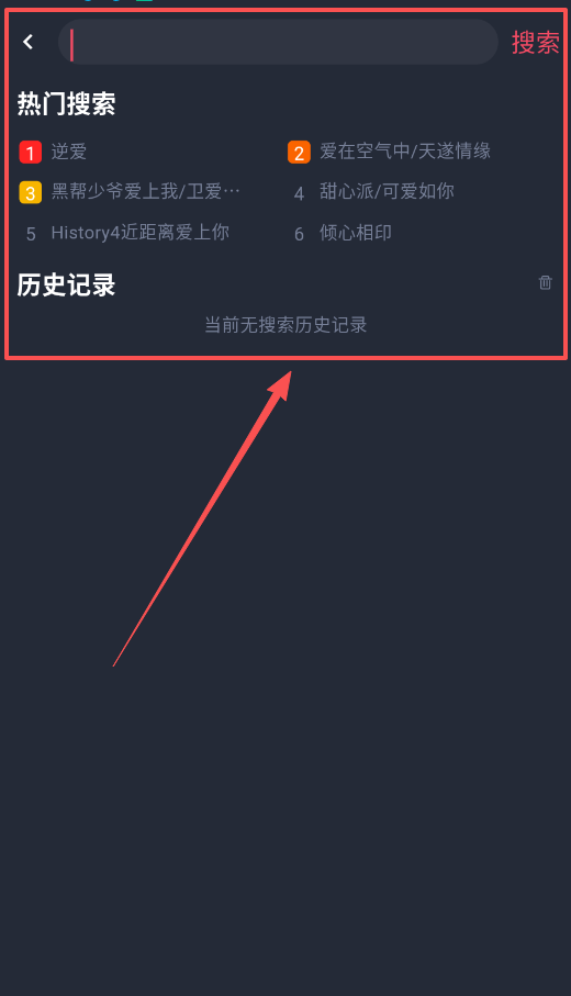 4、搜索页面的热门榜单很有参考价值,"History4近距离爱上你"等剧集的排名反映了当前热度,配合无历史记录的清爽界面。
