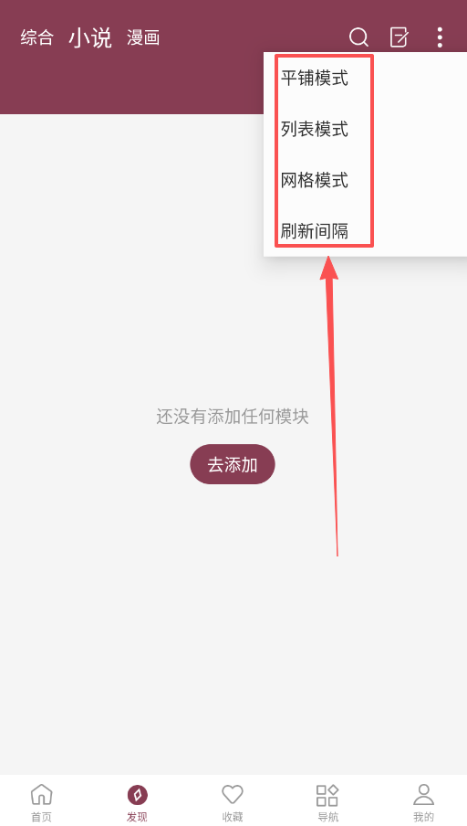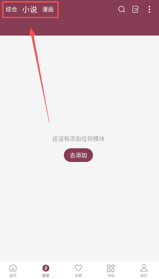 1、首先打开软件首页,顶部可选择综合、小说或漫画分类浏览内容,页面暂时没有内容模块,完成后就能快速找到喜欢的内容了。