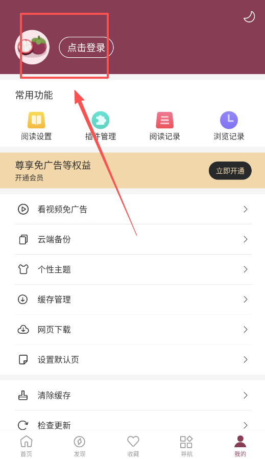 3、登录账号后能在我的页面使用阅读设置、插件管理等常用功能,开通会员可以享受免广告、个性主题等权益。