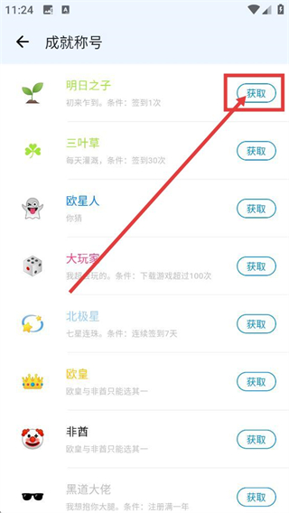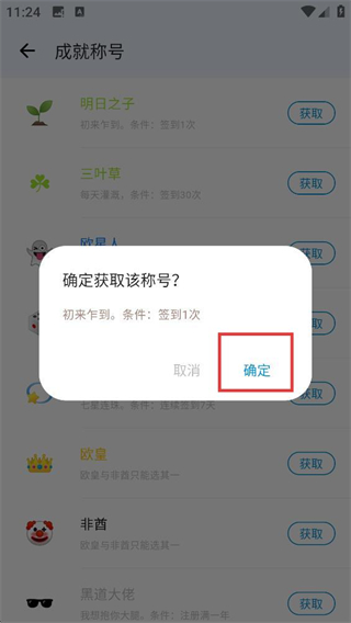 3、在成就称号页面找到已满足条件的【明日之子】称号,点击其右侧【获取】按钮,触发称号领取确认弹窗啦。