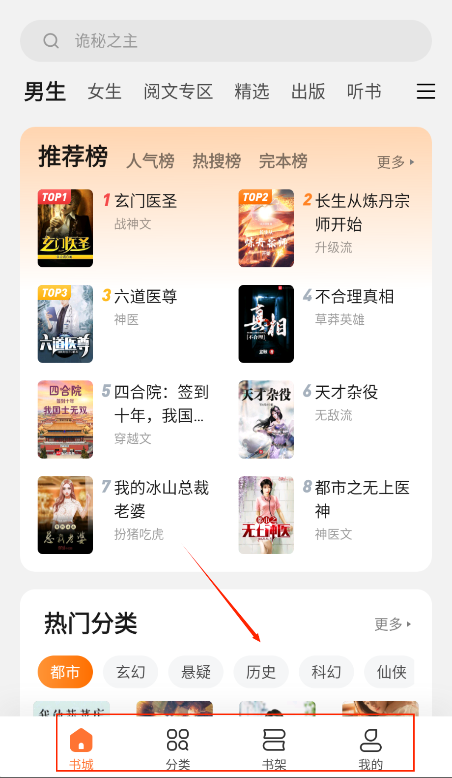 4、善用底部导航栏在书城、分类、书架和我的页面间切换,不同页面提供不同功能满足各种阅读需求。