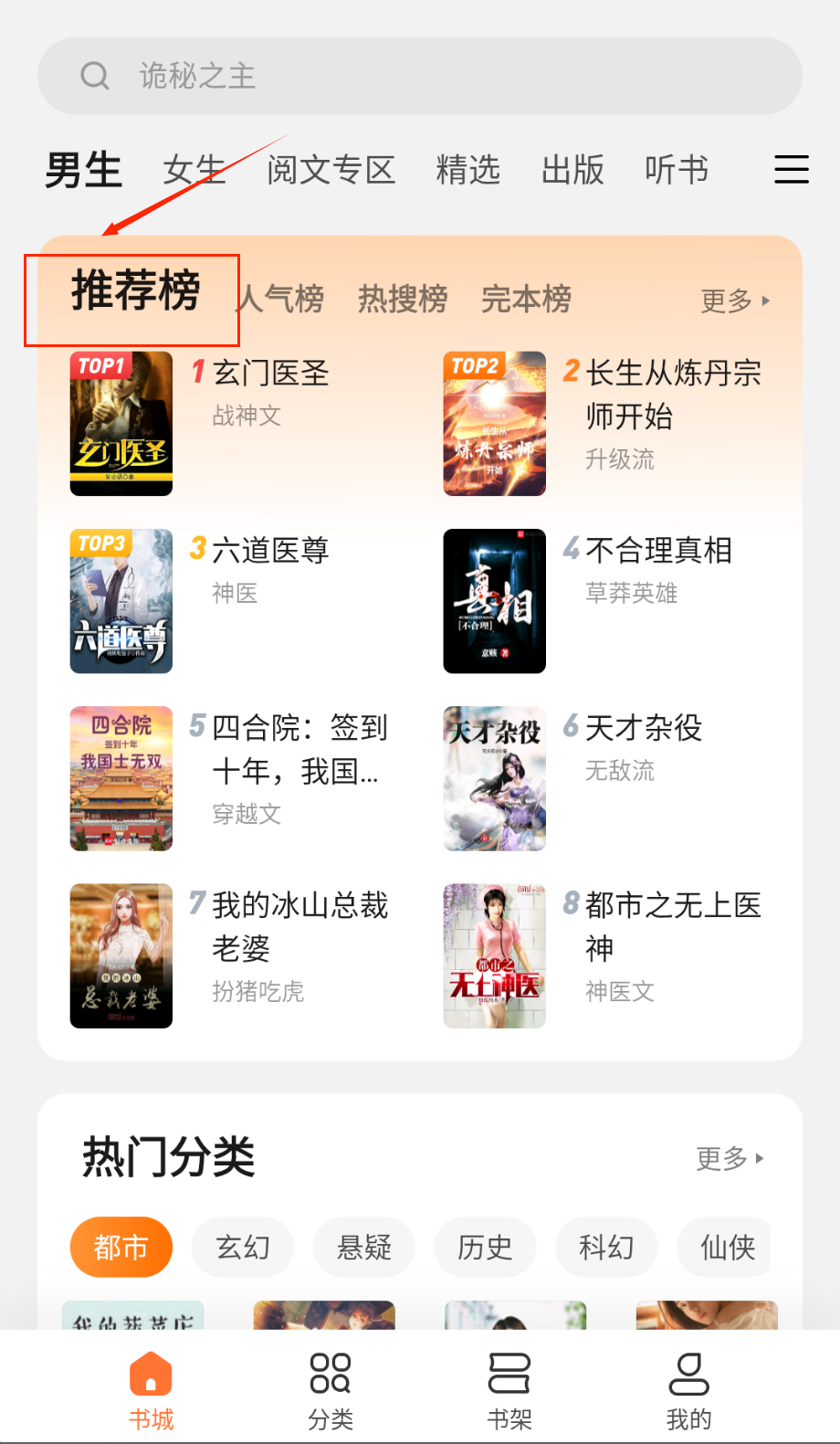 3、推荐榜区域展示各类热门作品,通过TOP排名和类型标签能快速了解作品特点,点击更多可以看到完整榜单。