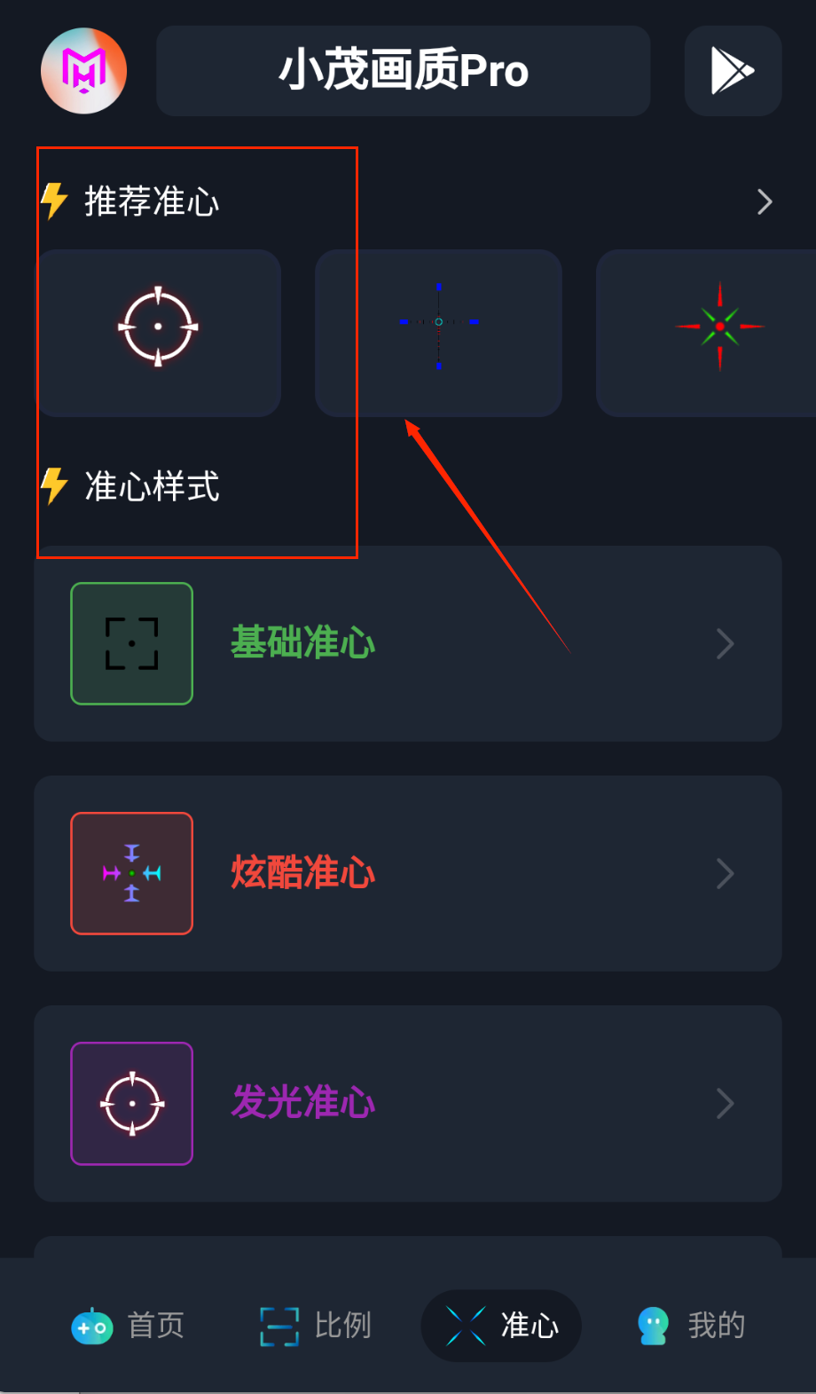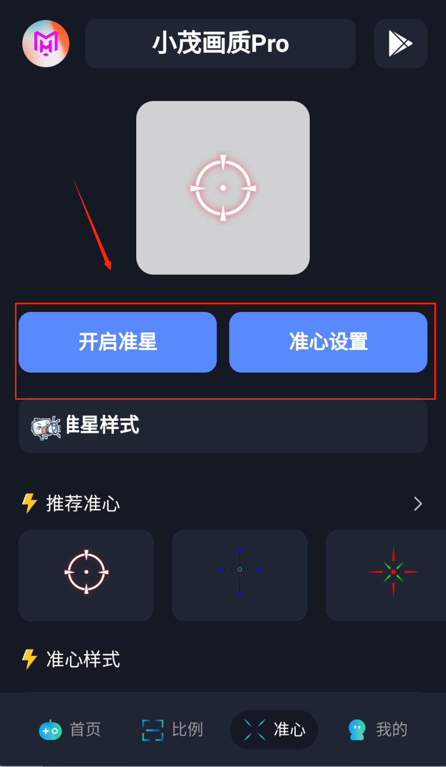 1、进入准心功能页面先点击开启准星按钮激活功能,然后才能选择具体的准星样式进行设置。