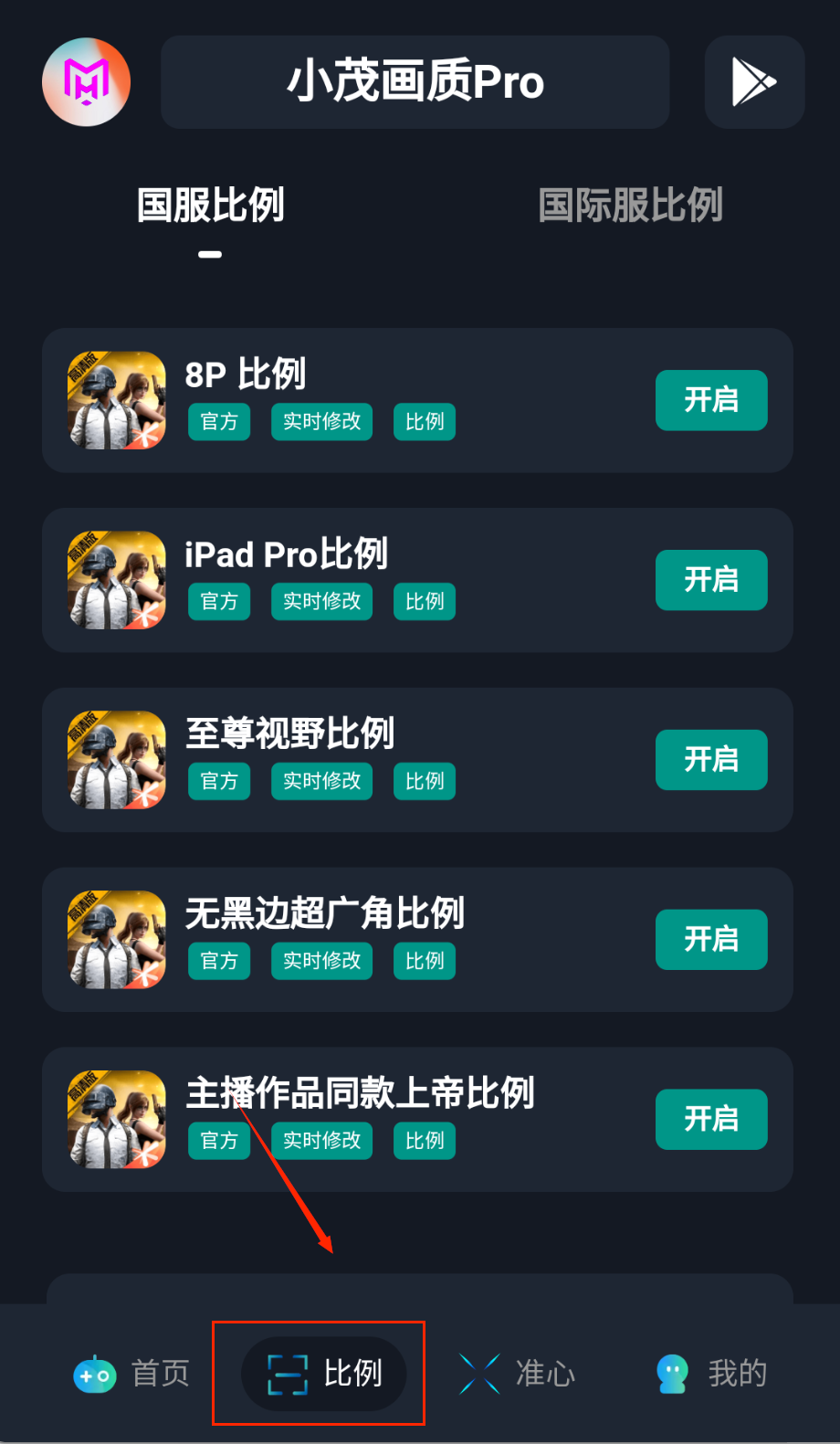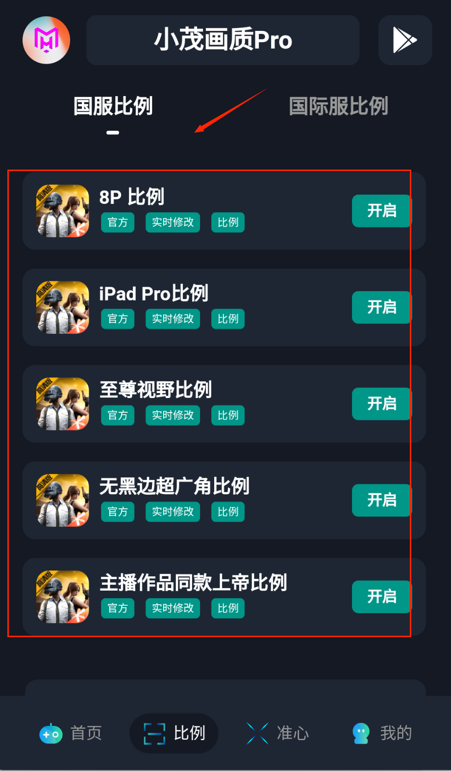 1、完成授权后返回首页,点击比例功能进入画面比例调整界面,这里提供8P、iPad Pro等多种预设比例可选。