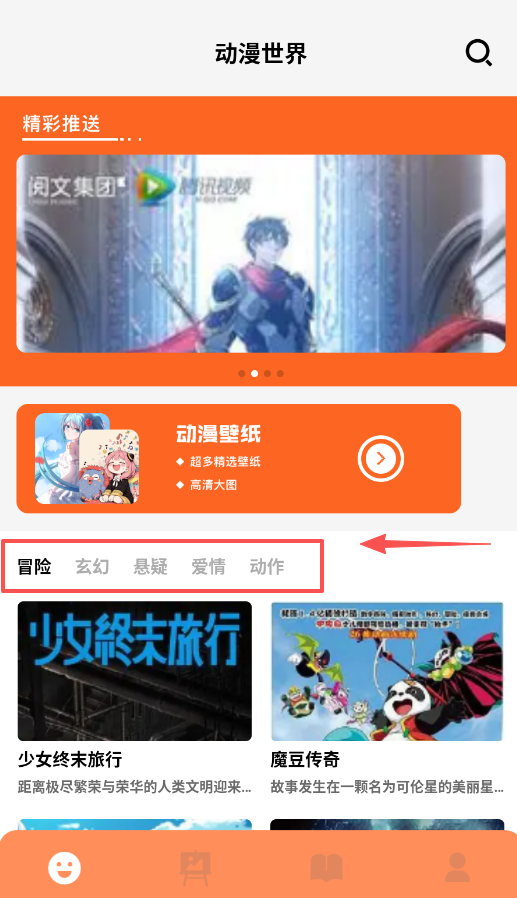 2、动漫世界页面最好玩了,上面有滚动的推荐,下面可以按标签找玄幻、悬疑这类漫画的壁纸,都是高清大图呢。