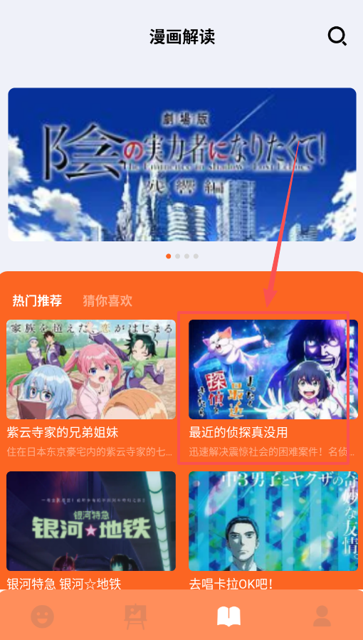 3、找漫画看的话,去漫画解读页,那里有热门推荐和猜你喜欢,像最近的侦探真没用这类作品,点开就能直接看。