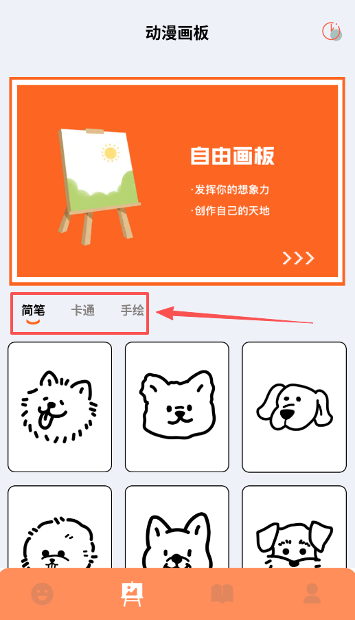 4、手痒想画画,就去动漫画板,选个喜欢的风格比如卡通或手绘,在自由画板上随便涂鸦,创作自己的小天地吧。