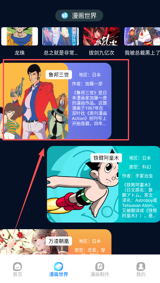 2、在漫画世界板块,你可以浏览龙珠、鲁邦三世等热门作品,让你在深入阅读前就能有个全面的了解。