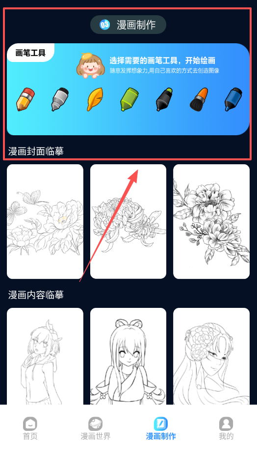 3、如果你想自己创作,点击漫画制作功能,选择画笔工具开始绘画,可以随意发挥想象力临摹封面或内容。