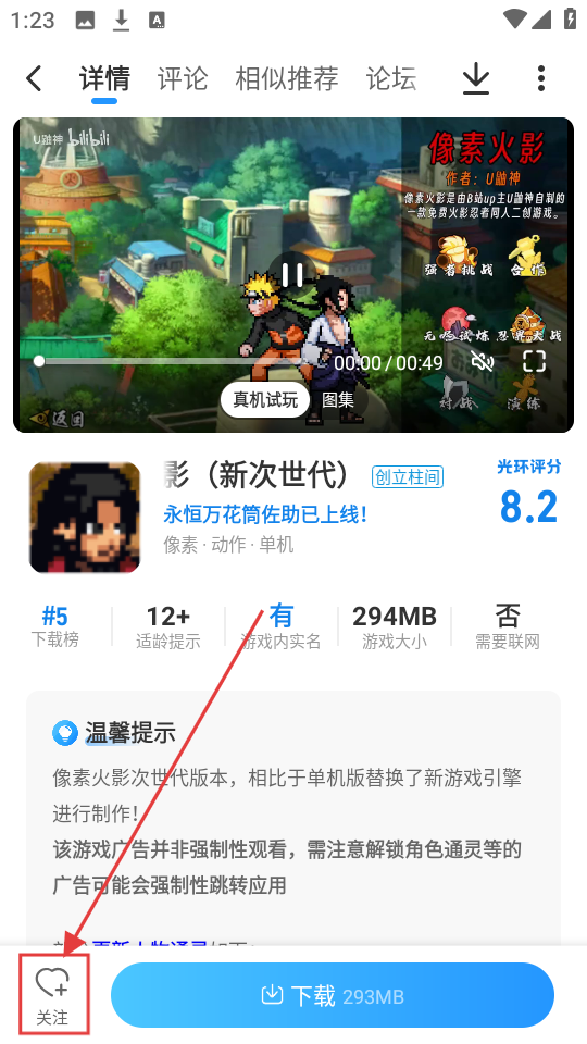 3、当我们进入某款游戏详情页,如果觉得游戏不错,还能点击页面左下角的【关注】按钮,就可以成功收藏游戏了。
