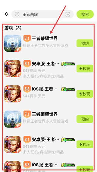 3、在搜索结果中,选择目标游戏,如安卓服-王者荣耀,可进入游戏详情页啦。